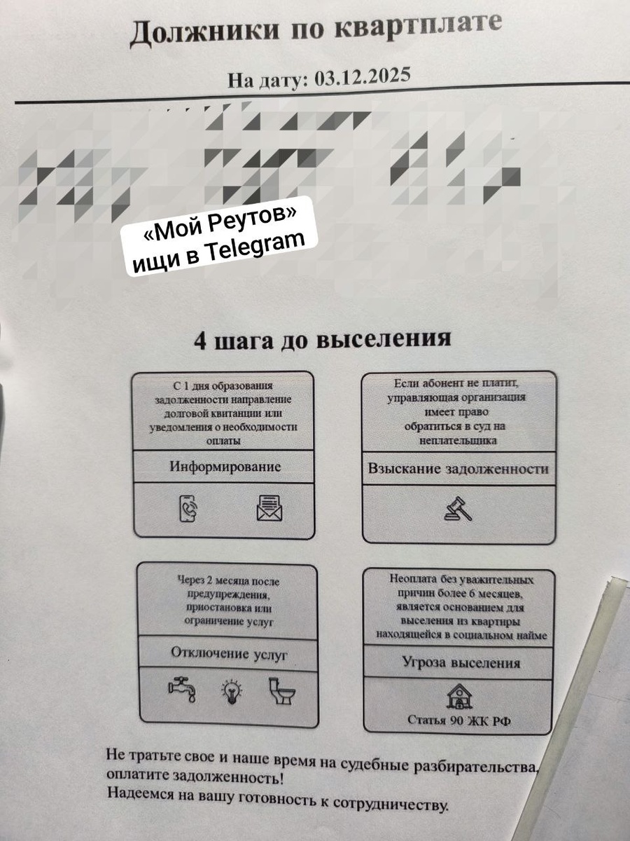 🗣"Угроза выселения": в подъездах Реутова начали вывешивать списки должников в новом формате. 📸#отподписчиков 🤩 Подписаться | Прислать новость | ВКонтакте | Дзен | OK | Чат