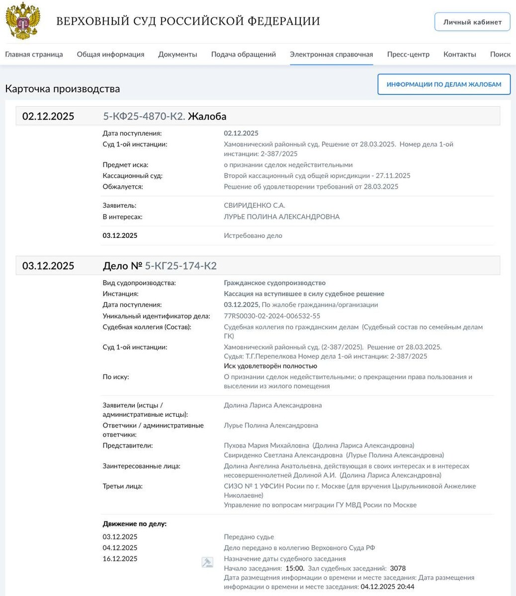 Верховный Суд РФ назначил на 16 декабря рассмотрение кассационной жалобы адвоката Свириденко С.А. в интересах Лурье П.А. по общеизвестном квартирному спору Лурье и Долиной. Кассационная жалоба была подана 2 декабря, 3 декабря - дело истребовано, а 4 декабря - передано на рассмотрение в Судебную коллегию по гражданским делам Верховного Суда РФ. Рекордная скорость передачи дела на рассмотрение говорит о том, что судьям дали добро на рассмотрение дела по закону. Долина в экстренном порядке пытается склонить Лурье к мировому соглашению. Долина предлагает выплачивать Лурье деньги в течении нескольких лет. Для этого уже привлечен 1 канал, куда пытались заманить Лурье на ток -шоу с Долиной. Лурье хватило мудрости не ходить на эти шоу. От кабального мирового Лурье тоже отказалась.