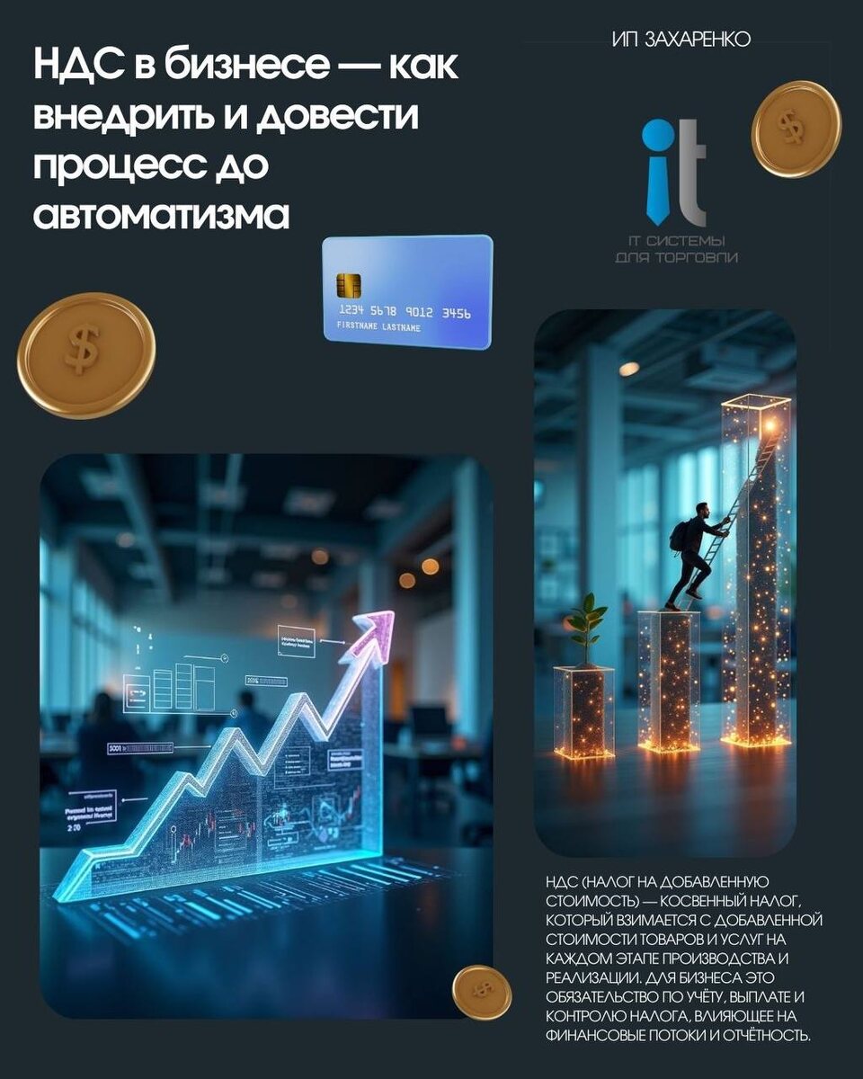 Что такое НДС и зачем он нужен НДС (налог на добавленную стоимость) — косвенный налог, который взимается с добавленной стоимости товаров и услуг на каждом этапе производства и реализации. Для бизнеса это обязательство по учёту, выплате и контролю налога, влияющее на финансовые потоки и отчётность. Внедрение системы НДС в бизнес 1. Регистрация плательщиком НДС Важно своевременно зарегистрироваться в налоговых органах как плательщик НДС, если оборот компании превышает установленный порог (в России — 2 млн ₽ за 3 месяца). 2. Настройка бухгалтерского учета Нужно адаптировать учетные программы (1С, «Моё дело», ERP-системы) для правильного ведения счетов-фактур, расчёта и контроля НДС. Важно разделять входящий и исходящий НДС. 3. Правильное оформление документов Выставление корректных счетов-фактур по новым требованиям законодательства с обязательным отражением суммы НДС. 4. Обучение сотрудников Персонал бухгалтерии и отдела продаж должен быть обучен основам работы с НДС — чтобы избежа