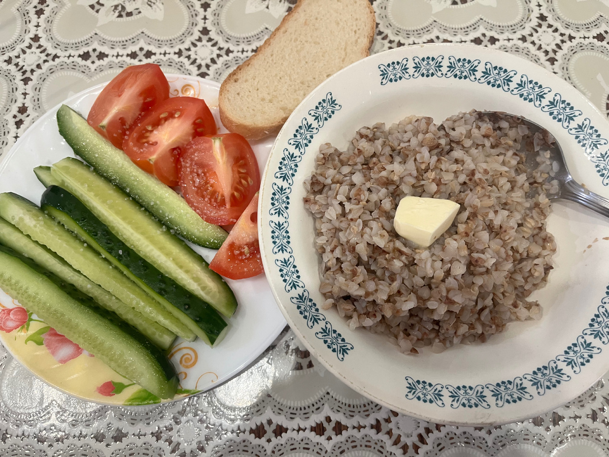 Итак на завтрак мы с Тимкой поели мягкие вафли с бананом, которые накинуне купила в магазине. Фото не делала. Утро в спешке прошло.🫣 Себе на обед порезала один помидор и огуречик. Погрела гречку и сверху положила кусочек сливочного масла. Так вкуснее и сытнее. Это что-то ела после садика и прогулки. Купила в пятерочке чебуреки. Они показались мне вкуснее, чем в магните. Ну или я просто голодная была. И доела остатки винегрета. А в магните купила сегодня гирлянду со звездами. Она переливается разноцветными огоньками. Красную мишуру. 2 метра. И мелкие золотые шарики. а еще купила елочку искусственную елочку в Фикспрайсе за 399₽. Сначала я хотела маленькую, но поняла, что нет для меня этого эффекта. Поэтому побольше. Дома с Тимкой мы расправляли и наряжали нашу зеленую красавицу. Как это было здорово!!! Маленькие радости)🎄 Фото было лень делать. Простите, как нибудь потом. А гирлянду я развесила по стене вдоль окна. Сразу появилось новогоднее настроение. Хоть и снега нет) но