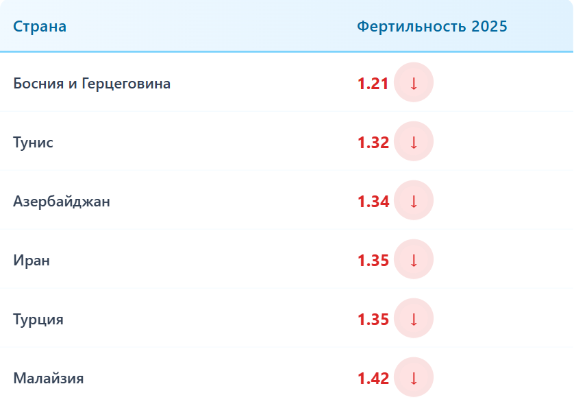 В 2025 году сразу три страны с традиционно высокой рождаемостью - Иран, Турция и Азербайджан - опустились по уровню фертильности ниже России.