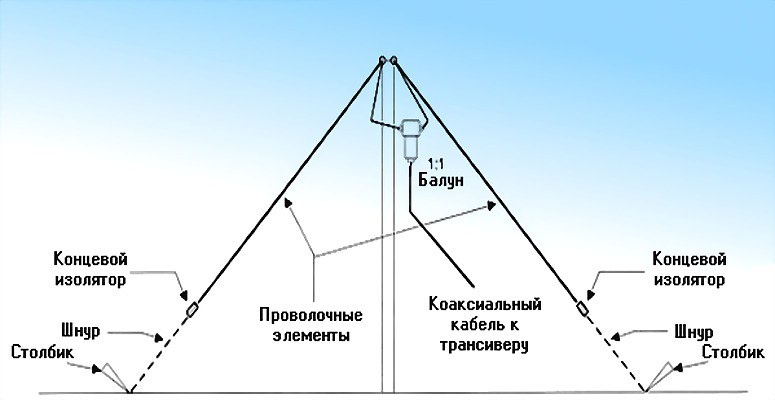 Геометрия полуволновой резонансной дипольной антенны Inverted V