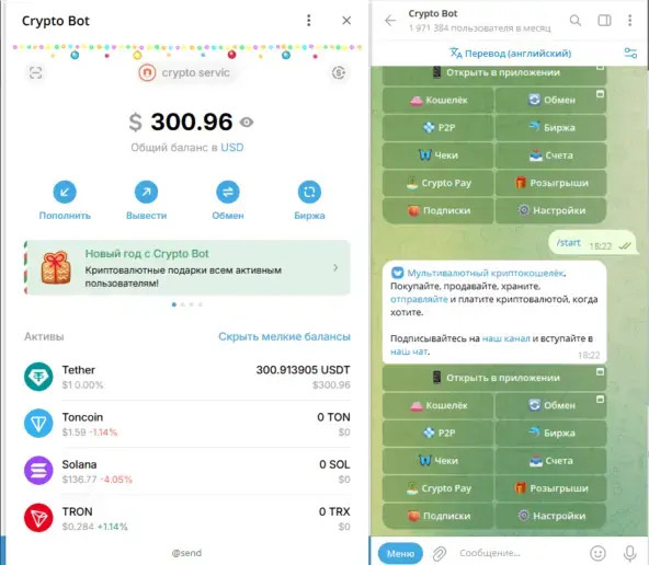 В этом рейтинге собрали крипто-ботов телеграмм которые занимают первые места по количеству пользователей, функциональности, и доступности Crypto-bot Crypto Bot — централизованный крипто-кошелёк в Telegram. Crypto-bot - один из первых криптоботов в телеграмм а на текуший момент лидер по количеству пользователей в месяц Основное: Аккаунт создаётся в один клик в вашем Telegram-аккаунте. Поддерживает USDT, TON, BTC, ETH, LTC, BNB, TRX, USDC, GRAM. Возможности: Пополнение: прямой перевод или Р2P-рынок. Вывод: через Р2Р на карту или по адресу кошелька. Чеки: создание и активация для переводов. Комиссии: за депозит нет, за операции (Р2Р, спот) - низкие. Плюсы Простота и доступность. Создание и управление кошельком интуитивно понятны, справится даже новичок. Хорошая обучающая база. Для всех ключевых действий есть подробные текстовые инструкции и видео-гайды. Торговые возможности. Встроенная спот-биржа для торговли криптовалютой. Удобный Р2Р-обмен. Функционал для прямой покупки и прод