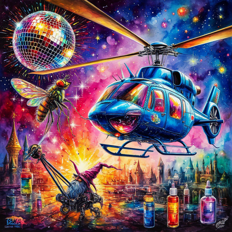 Он нетерпеливо схватил меня за рукав, оставляя пятна от краски, которую так и не смог до конца стереть с рук, и потащил меня к платформе с типовой душевой кабиной. В кабине летали и ползали по стенкам десятки мух, вымазанных жёлтой, голубой, красной, синей, фиолетовой, зелёной, оранжевой красками.