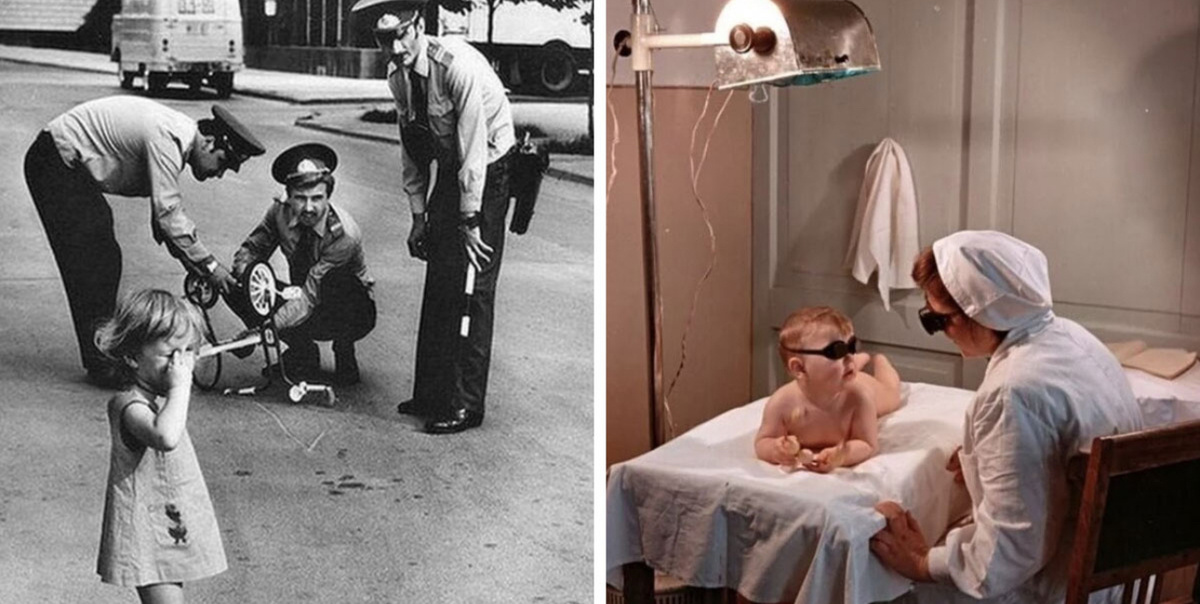 Столько тепла и душевности в этих фотоснимках, что невольно начинаешь грустить. Хотелось бы, чтобы и в дне сегодняшнем было больше теплоты в отношениях между людьми, невзирая на войны и все трудности. Снимок 80-х прошлого века: Представители правоохранительных органов ремонтируют малышке велосипед Босоногая девчушка бежит по полю с обедом для своего отца-тракториста 1987-й год: Комната общежития В яслях заботились, чтобы малыши получали достаточно ультафиолета Счастливая молодая семья возле приобретенного автомобиля ВАЗ-2101 В 70-е прошлого века в каждом советском гастрономе можно было купить за десять копеек томатный сок. И к нему всегда была бесплатная соль: насыпай, сколько хочешь Фото радиохулигана Победители конкурса молодых штукатуров Фотоснимки бассейна «Москва», сделаны в 1964-м году Фото 1955-го года: Маленькие жители Сахалина идут в школу 1-го сентября В 70-х прошлого века в советских городских парках можно было видеть такие позорные щиты В ко
