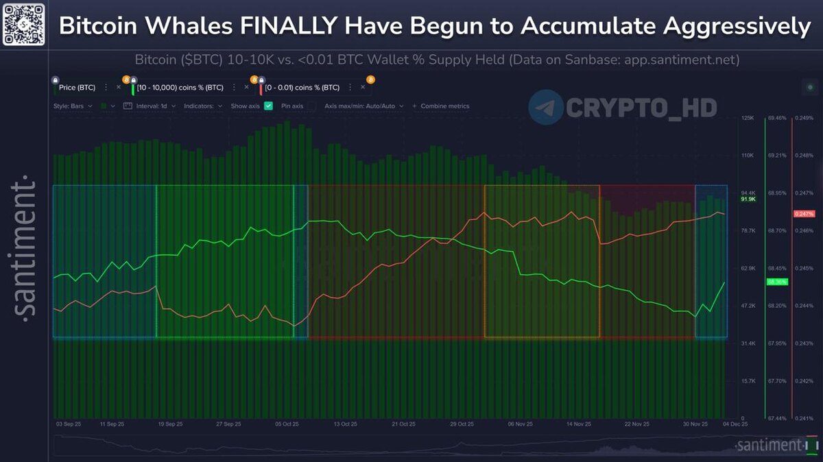 🐋 Киты и акулы купили 47,584 BTC ($4,26b) с начала декабря – Santiment