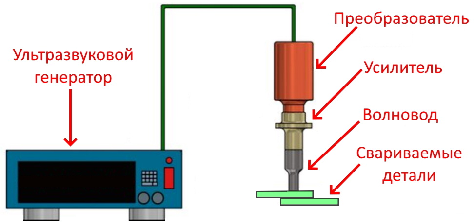 Высокочастотный ток из генератора поступает на преобразователь в колебательной системе, который превращает электрические колебания высокой частоты в собственные механические колебания, за счет эффекта магнитострикции. Амплитуда собственных колебаний преобразователя незначительна, и ее недостаточно для осуществления процесса ультразвуковой сварки. Поэтому механические колебания передаются на усилитель, который жестко присоединен к преобразователю. Усилитель, за счет разницы площадей сечений на его торцах, увеличивает амплитуду колебаний в несколько раз. Каждый усилитель имеет свой коэффициент усиления амплитуды. После чего колебания передаются на волновод, который так же жестко связан с усилителем. Задача волновода передать ультразвуковые колебания к свариваемым деталям и сформировать шов в процессе расплавления пластика. На данный момент существуют два типа ультразвуковых колебательных систем, которые отличаются видом преобразователей: пьезокерамические и магнитострикционные.