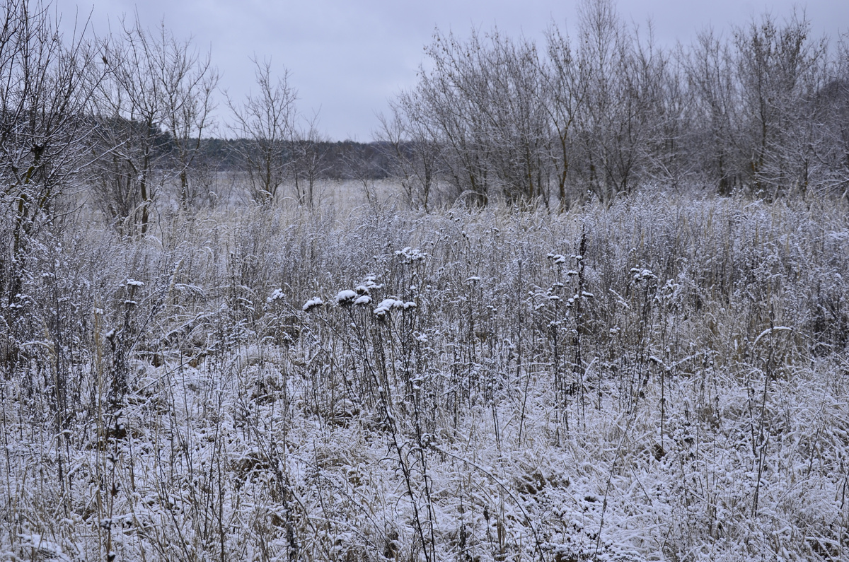 К нам, в Пензенскую область, пришла наконец-то зима. Долго собиралась, всё ходила вокруг да около, как будто не могла решиться. Зашла, как бы невзначай, посмотреть одним глазком — ждут ли, рады ли? Несмелыми и робкими штрихами, как юный неопытный художник, ночью раскрасила всё вокруг. Припорошила лёгким снежком окрестности и несмотря на хмурое и серое небо, картина преобразилась и ожила. Почерневшие уже давно травы,приобрели структурность о объём. Тысячелистник нарядился в белые, пушистые шапочки. Самые стойкие травы ещё возвышаются в человеческий рост и кокетливо склоняют свои колоски, украшенные снежинками. Шикарно смотрится заснеженный дудник. Очаровательные зонтики. Интересный сеянец какого-то дерева, которого я не видела летом из-за высокой травы. Скорее всего, дикая яблонька. Нужно будет обратить на него внимание весной. Черно-белая графика. Моё любимое место для прогулок и тропинка к речке. С правой стороны вдалеке виднеется крыша моего дома. Вот такая утренняя небо