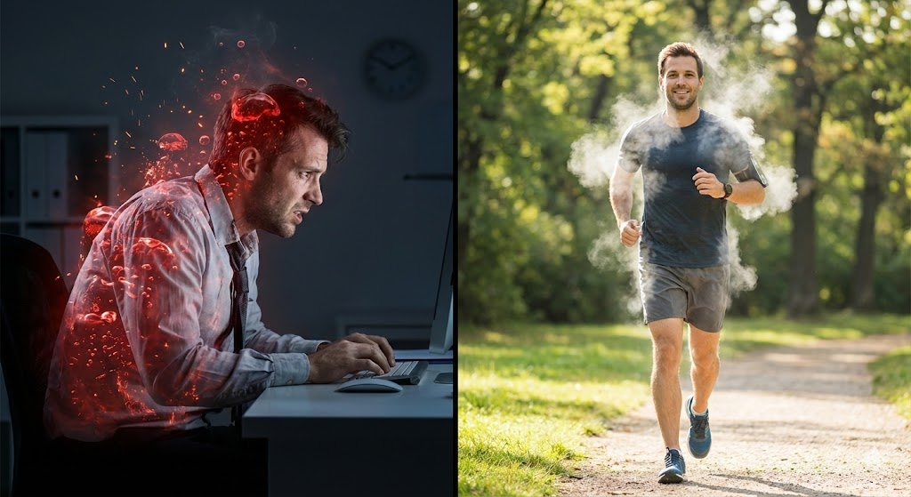 В природе кортизол выделяется для активных действий. Древний человек, увидев опасность, либо сражался, либо убегал. В современном мире мы «сидим в стрессе» на стуле. Гормон, не найдя выхода в движении, начинает разрушать организм изнутри. Единственный способ «сжечь» лишний кортизол — дать мышцам работу. 1. Спорт как антидот от стресса Физическая активность работает как клапан для сброса давления. Как это работает: Регулярные тренировки снижают базовый уровень кортизола и повышают выработку эндорфинов — естественных обезболивающих и «гормонов радости». Механизм: Работающие мышцы активно потребляют глюкозу (которую кортизол выбросил в кровь «про запас»), снижая риск диабета и ожирения. Важное правило: Умеренность. Легкая пробежка, плавание или йога снижают стресс. А вот изнуряющие марафоны или тяжелые веса на пределе возможностей, наоборот, могут спровоцировать новый мощный выброс кортизола. 2. Сон: перезагрузка системы Кортизол и мелатонин (гормон сна) — это антагонисты. Когда один в