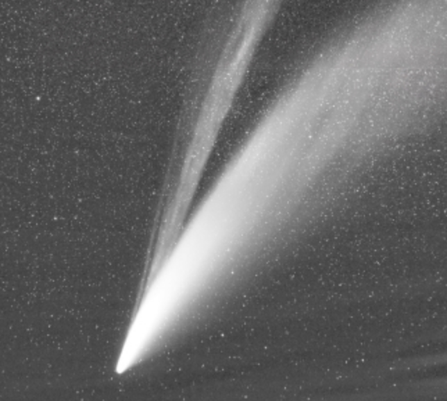 · Пылевой хвост: Состоит из мелких частиц пыли, сдуваемых с комы. Имеет желтоватый оттенок (отражает солнечный свет) и часто бывает широким и изогнутым, так как пылинки движутся по своим орбитам.