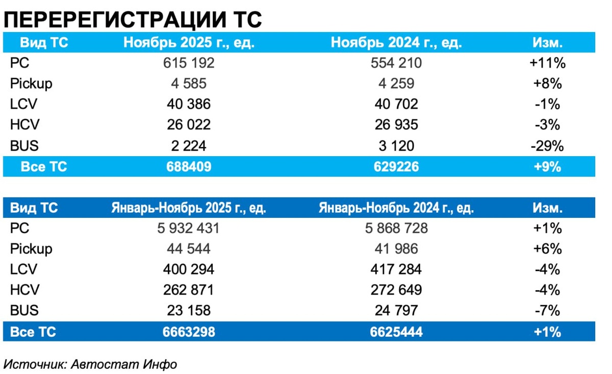 Перерегистрации ТС в России: ноябрь +9 %, год всего +1 % По данным «Автостат Инфо», в ноябре 2025 года рынок подержанных транспортных средств в России ускорился: было перерегистрировано 688,4 тыс. ед. ТС, что на 9% больше, чем в ноябре 2024-го. Накопительный итог за январь–ноябрь текущего года: 6,66 млн перерегистраций, что лишь на 1% выше уровня прошлого года, но сам ноябрь явно тянет статистику вторичного авторынка вверх. Каркас рынка по-прежнему формируют легковые автомобили. На них приходится около 90% всех сделок: 615,2 тыс. перерегистраций в ноябре (+11% год к году) и 5,93 млн ед. за одиннадцать месяцев (+1%). То есть именно легковушки обеспечили рост всего рынка в конце года, частично компенсировав более слабые сегменты. Малый, но показательный сегмент — пикапы. В ноябре их перерегистрации увеличились на 8% (4,6 тыс. против 4,3 тыс. год назад), а за январь–ноябрь — на 6%. Объемы невелики, но динамика стабильная, что говорит о закреплении спроса как в частном, так и в малом к