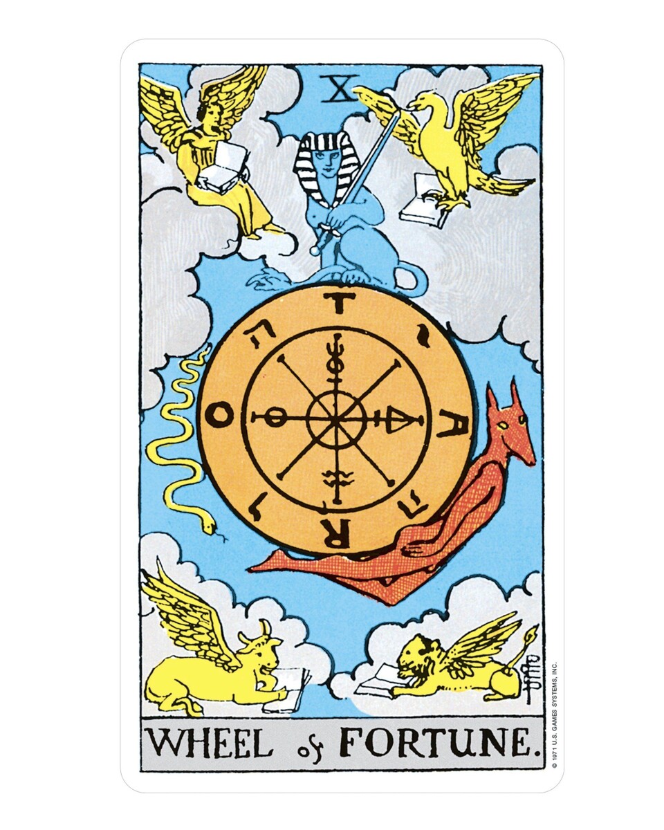 Приветствую, искатель знаний! О чем шепчут спицы Колеса фортуны? Что несет их шепот нам, спрашивающим совета у мудрых карт Таро? И так хорошо рассмотрим карту... На карте изображено само Колесо Судьбы, парящее между небом и землей. На его ободе – таинственные буквы T-A-R-O и священные еврейские буквы YHWH (имя Бога), знаки алхимических элементов и змея Тифона. Вращает его загадочный красно-синий сфинкс с мечом (символ уравновешенной силы), а по бокам восседают Анубис (проводник в мир иной, тьму) и змей Сет (сила нисходящего потока). На вершине Колеса – сфинкс в золотых одеждах, знак победы духа. Все это происходит в водах бессознательного, из которых поднимаются четыре крылатых существа (тетраморф), символизирующие евангелистов и стихии, читающие свитки мудрости. Символика: это вечный цикл подъемов и падений, закон причины и следствия (кармы), момент неожиданного поворота, божественный промысел и связь всех вещей. Прямое (положительное) положение Это карта судьбоносного поворота, шанс