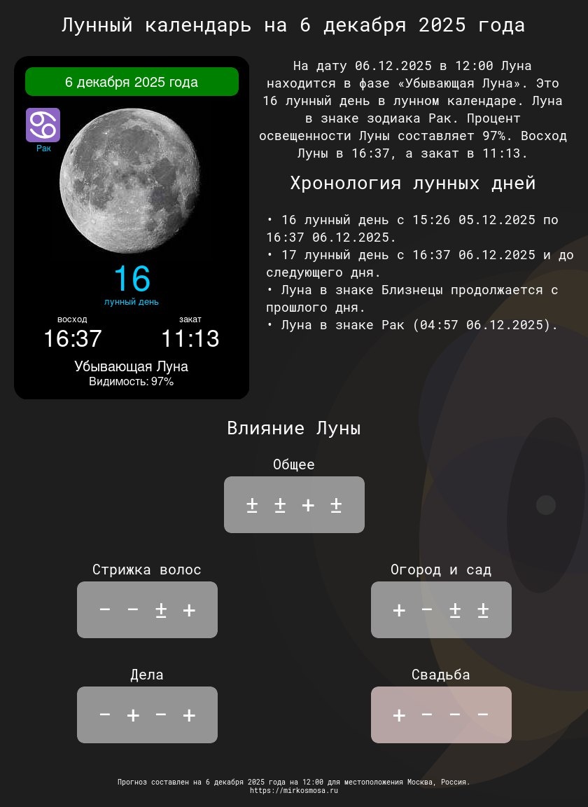 Лунные календари на 6 декабря 2025 года: Подготовьтесь к этому дню с учетом влияния Луны! 🔹🌗 Лунный календарь на 6 декабря 2025 года — Что приготовила Луна? Подробнее 🔹✂️ Лунный календарь стрижек на 6 декабря 2025 года — Подходящий ли день для обновления прически? Подробнее 🔹🌱 Лунный календарь огородника и садовода на 6 декабря 2025 года — Лучшее время для ухода за растениями. Подробнее 🔹📅 Лунный календарь дел на 6 декабря 2025 года — Удачные моменты для важных задач. Подробнее 🔹💍 Лунный календарь свадеб на 6 декабря 2025 года — Подходит ли этот день для вашего торжества? Подробнее