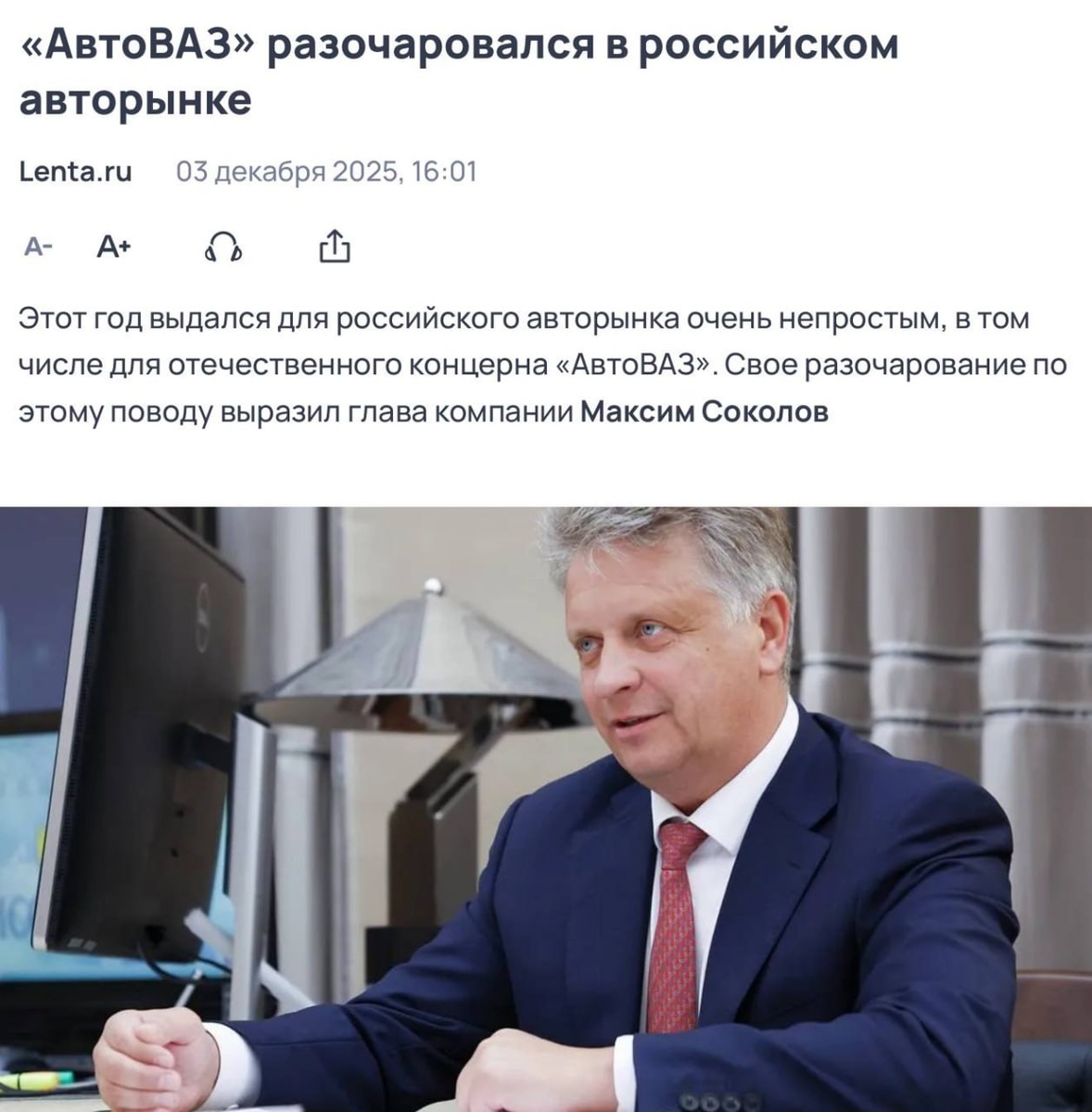В ответ на пост АвтоВАЗ разочаровался в отечественном рынке, который в этом году оказался «очень вялым». В результате концерн не собирается презентовать свои новые разработки, заявил глава АвтоВАЗа Соколов. «Нам точно не до новых моделей», отметил он На фоне проблем с продажами на внутреннем рынке руководству АвтоВАЗа пришлось временно перевести сотрудников на четырехдневную рабочую неделю. Подобный режим решили сохранить до конца июня 2026 года @geonrgru | YouTube | sponsr.ru