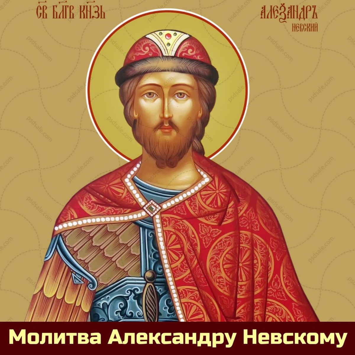 Молитва святому благоверному князю Александру Невскому. О, святы́й благове́рный кня́же Алекса́ндре! При́зри ми́лостивно на ны, недосто́йныя рабы́ Бо́жии (имена), и исхода́тайствуй нам житие́ ти́хое и безмяте́жное, и к ве́чному Ца́рствию ше́ствие неукло́нное твои́м предста́тельством устро́й нам, да сохрани́т нас Госпо́дь Бог Свое́ю благода́тию в ми́ре, здра́вии, долгоде́нствии и вся́ком благополу́чии в до́лжайшая ле́та, да при́сно сла́вим и благослови́м Бо́га в Тро́ице Святе́й сла́вимаго, Отца́ и Сы́на и Свята́го Ду́ха, ны́не и при́сно, и во ве́ки веко́в. Ами́нь. С праздником, православные!