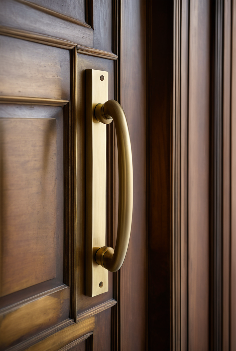 - Сочетание с дверью: Пропорции критичны. Массивная ручка-скоба требует монументального дверного полотна, в то время как на изящной двери она будет выглядеть неуместно.