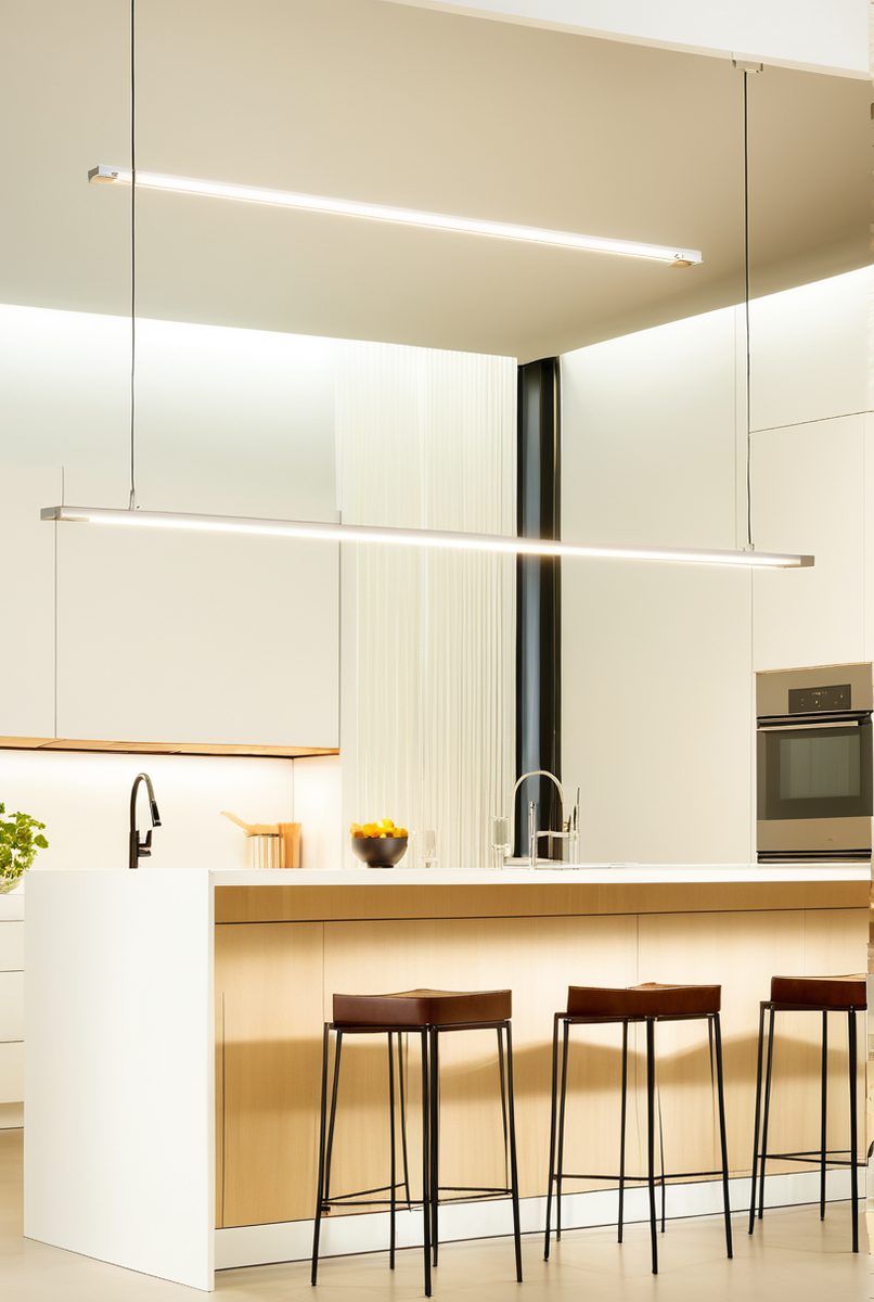 В жилых интерьерах профильный светильник раскрывает свой потенциал на полную, переходя от утилитарной функции к роли мощного инструмента дизайна. Одним из самых популярных сценариев является освещение для кухни, где длинный светильник, расположенный над кухонным островом, становится не только функциональным центром, но и визуальной доминантой. Он обеспечивает яркий, равномерный свет по всей рабочей поверхности, исключая тени, и одновременно подчёркивает геометрию острова, создавая уютное место для семейных завтраков или встреч с друзьями.