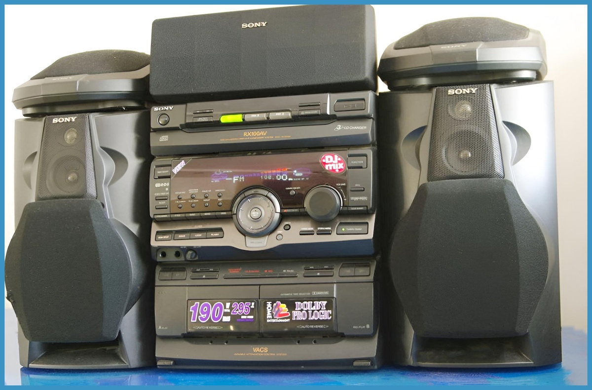"Sony MHC‑RX100AV" - представитель линейки мини‑компонентных Hi‑Fi‑систем конца 1990‑х годов, воплотивший в себе передовые на тот момент технологии и многофункциональность. Этот аппарат стал символом домашнего аудио того времени, предлагая пользователю широкий спектр возможностей для воспроизведения и записи музыки Система объединяет в одном корпусе: CD‑проигрыватель; кассетную дека; FM/AM‑радиоприёмник. Объёмный звук. Оснащён декодером Dolby Pro Logic Surround, позволяющим создавать эффект пространственного звучания при просмотре фильмов и прослушивании музыки. Дополнительные функции: караоке (вход для микрофона); таймер сна (sleep timer); будильник (wake‑up timer); система шумоподавления Dolby B‑type. Мощность акустики: фронтальные колонки: 105+105 Вт (8 Ом, 1 кГц, 10% THD); задние колонки объёмного звучания: 20+20 Вт (16 Ом, 1 кГц, 10% THD); центральная колонка: 45 Вт (8 Ом, 1 кГц, 10% THD). Входы/выходы: VIDEO/MD IN (phono): 250 мВ, импеданс 47 кОм; микрофонный вход (phone): чувс
