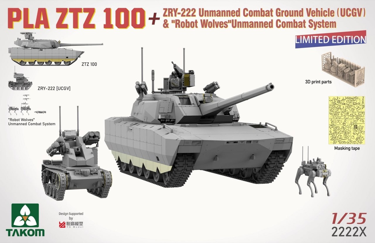 Ну и естественно, лимитированный набор от Takom с двумя новинками: Танк ZTZ 100, наземный боевой робот ZRY-222 и система боевых роботов "Robot Wolves". Содержит 3D-печатные детали и маскировочные маски.