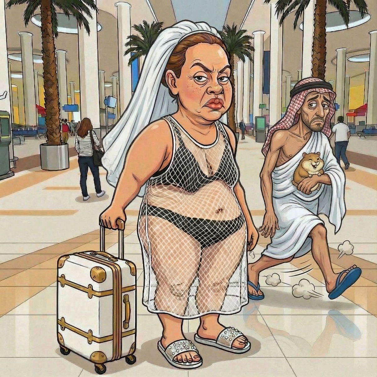 Она была богатой дамой, Она летела в ДубаИ, Фигстарс позвал её в программу "Отдых с арабом по любви". Она отбила телеграмму: "За деньги - да, беру билет", Достала с полок чемоданы, ПозвАла кур на женсовет. -Скажите, куры дорогие, А что там носят в Дубаях? Сейчас погоды там какие? Не в курсе кто, идите нах! Меня там ждут свиданья с шейхом И тыщща одна ночь любви! Да в смысле "у меня семейство"? Неважно, это ж се ля ви! Она сложила восемь сеток, Трусы, ботфорты и фату, В каменьях пластиковых тапки, Ещё другую ерунду. С восторгом куры угадали, Какой же будет цвет ногтей : Кофейный серо-буро-синий, Так стильно смотрится на Ней! И вот Она сошла по трапу, С пустыни жаркий ветер дул, Её мочалка развевалась, Тональник капал с мощных скул. Она ждала, что встретят шейхи И сразу увезут в отель, Там будет ванная с шампанским, И из кранов течёт "Шанель". Так с ножкой "ить" Она стояла, Готовая к любви вполне, Тут к ней подгрёб какой-то карлик В большой арабской простыне. - Я сейх Лисай Абдель Хад