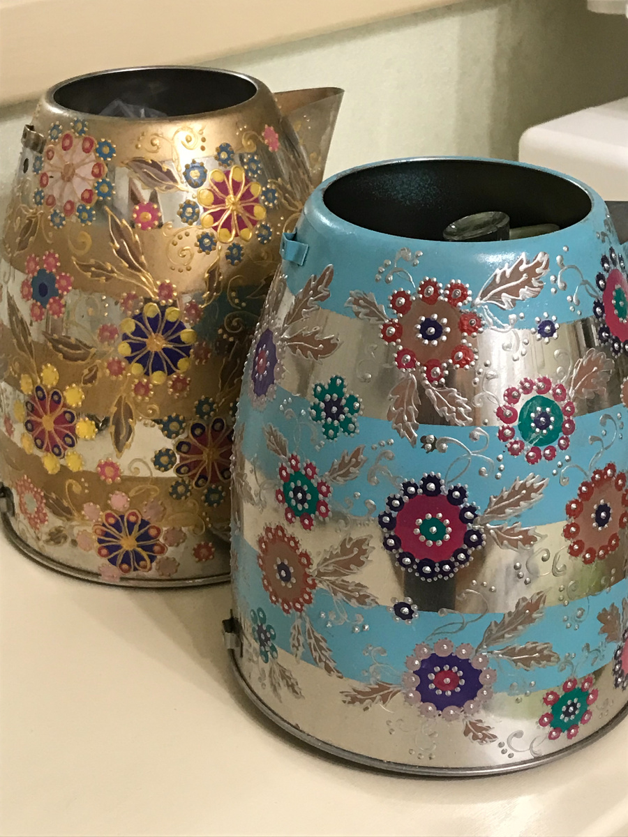 Из старого чайника. Вот сломался у Вас чайник. А потом сразу же второй, причем молниеносно, через два года всего. Что Вы будете делать? Бредете грустно к мусорному контейнеру, размахиваетесь с двух рук ( в них у Вас чайники) и резко запуливаете это честно нажитое добро на вершину мусорного контейнера. Так, ведь? А вот "рациональная хозяйка" изладит из этих чайничков нечто якобы полезное, пока неизвестного назначения и непонятного применения. Главное ведь, чтобы вокруг была красота-а-а))). Впрочем, вру немного)) Золотой чайничек давно служит маленькой мусоркой при рукодельных работах. Вместимость хорошая, объемчик самое то, вроде и мусор на виду, а в эстетическом варианте хранения. И с интерьерчиком не диссонирует. Когда ручки чешутся чего-нибудь "пофеячить", а глаз начинает искать область применения, непременно сам себе обоснуешь, объяснишь и убедишь в рациональном использовании только-что "нафеяченного"))) Наверно, у всех рукодельниц бывают моменты, когда "так хочу повязать, аж ку