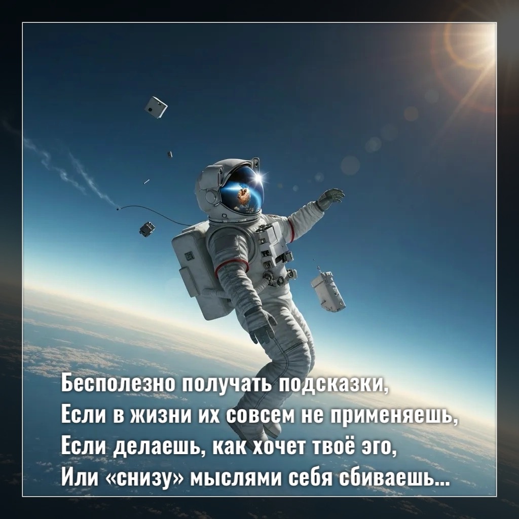 Бесполезно получать подсказки, Если в жизни их совсем не применяешь, Если делаешь, как хочет твоё эго, Или «снизу» мыслями себя сбиваешь, Вот опять попал в тупик или ловушку, Почему вновь не прислушался к словам, Которые вглубь Сверху посылали? Хотел набить все шишки сам? А время есть на падание, ошибки? А результат какой здесь будет после? Я знаю, ты умеешь вновь вставать, Но черти любят строить козни. И вот она борьба без остановки, Закончится когда-нибудь ничьей, Победой или проигрышем в жизни, Не избегай только Свыше идей, Итак уже сил нет почти что встать, Кровать теперь твой драгоценный друг, Ещё так пару раз споткнешься И будет «ночевать» с тобой недуг, Не нужно игнорировать подсказки, Всё вспомни и опять перечитай, Чтоб в следующий опасный миг, Ты не остановился невзначай.