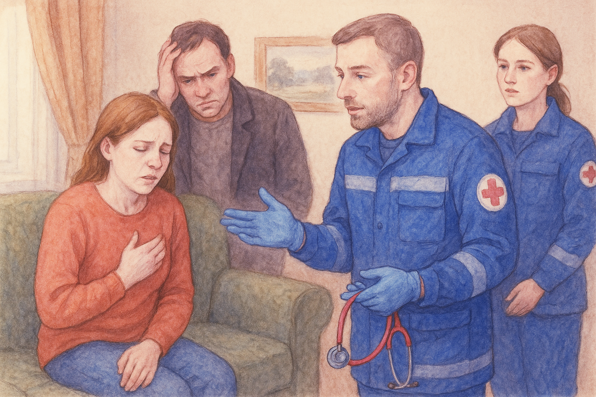 Она сидела на диване. Чуть бледная, держась за левую половину груди. Дышала часто, больше поверхностно. Рядом нервно расхаживал мужчина лет сорока. Он то и дело поправлял причёску.