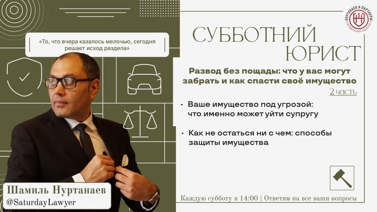 🔴🔴🔴🔴🔴 Развод без пощады: что у вас могут забрать и как спасти своё имущество? — 2 часть Сегодня 6 декабря в 14:00 вы узнаете ответ на этот и на многие другие вопросы на "Субботнего Юриста" ⚖️ Эфир проведет юрист с более, чем 20 летней практикой – Шамиль Нуртанаев (нажав на имя вы можете узнать о юристе больше). Тема эфира: «Битва за активы» 📝 Вот основные вопросы, которые мы обсудим в эфире: 1. Ваше имущество под угрозой: что именно может уйти супругу? 2. Как не остаться ни с чем: способы защиты имущества? Также, каждый может задать свой вопрос любым удобным для вас способом, перейдя по ссылке: https://clck.ru/3ByDxh Или же просто напишите вопрос в комментариях к посту Получите юридическую консультацию, не выходя из дома! 🎥 Записи эфиров на нашем Rutube: https://rutube.ru/channel/40148985/ VK Видео: https://vk.com/video/@vk.nurtanaev Дзен: https://clck.ru/3DQGpA ⚡️⚡️⚡️⚡️Трансляция пройдет на платформе VK Видео и Rutube, по ссылкам ниже👇 ✅ Присоединяйтесь к эфиру сего