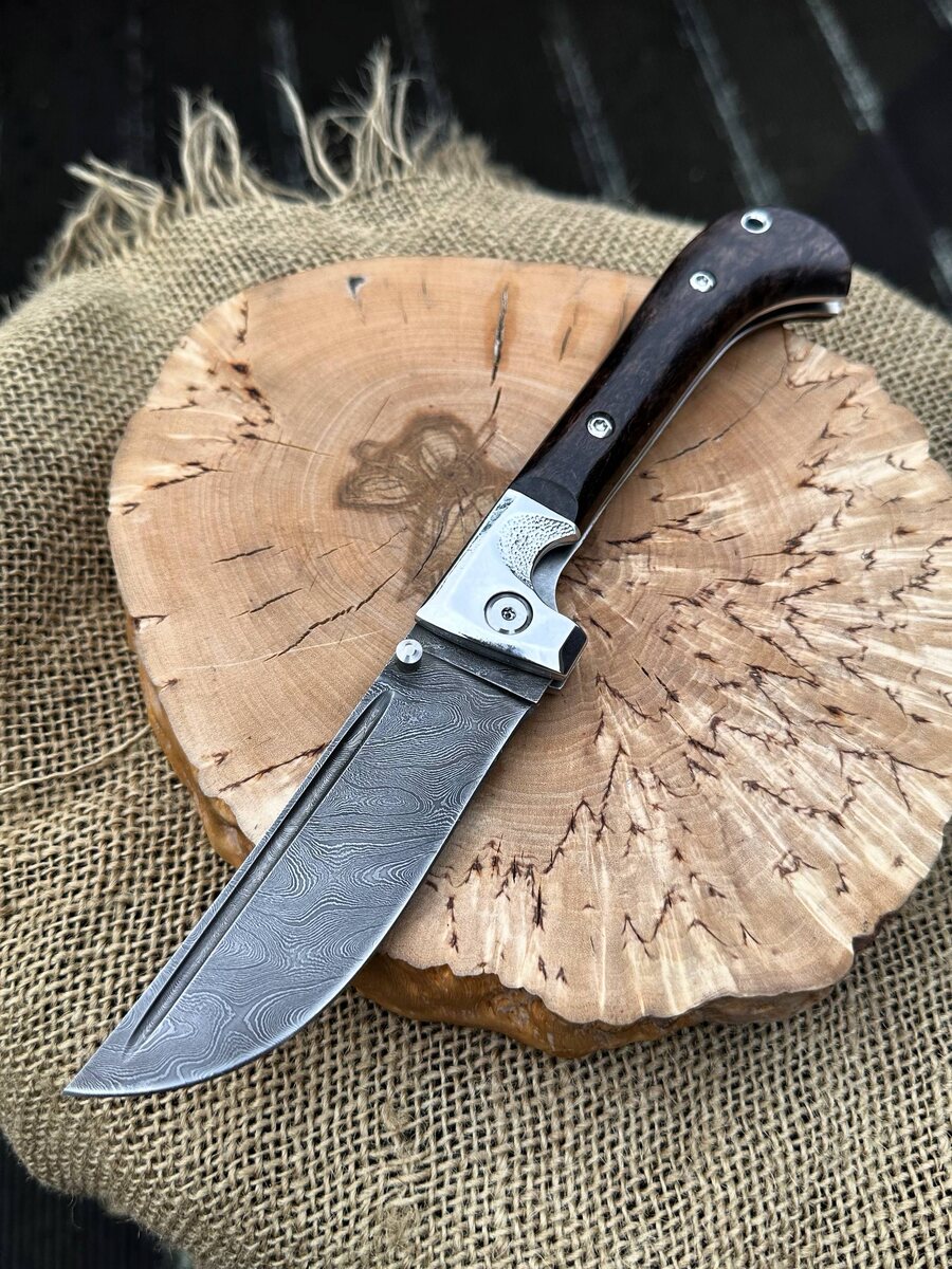 🔪 Новый складной Пчак для полевой кухни — уже в продаже! Идеальный выбор для охотников, рыбаков, туристов и ценителей ручной работы. - Клинок из дамасской стали (950 слоёв, HRC 62) — сочетание высокой твёрдости и уникального рисунка. - Рукоять из стабилизированной карельской березы коричневой— прочность, влагостойкость и комфортный хват даже в суровых условиях. - Надёжный замок Liner Lock — ваша безопасность во время работы. - Дол на клинке и бритвенная заточка — точность реза и удобство чистки. - В комплекте — ножны. *По желанию — формованные ножны из кожи растительного дубления (+8000 руб)*. Преимущества: - Ручная работа 3-го поколения мастеров. - Контроль качества на каждом этапе, пожизненная гарантия. - Удобство и надёжность — для настоящих ценителей! Цена со скидкой — 12 377 руб. (обычно 13 530 руб.) Готов к отправке! Пиши для заказа: 🔹 [@Nazarklinokbot](https://t.me/Nazarklinokbot) 🔹 WhatsApp/Viber: +7 910 134-38-31 #пчак #дамасск #складнойнож #кузницаназарова #полеваякухня