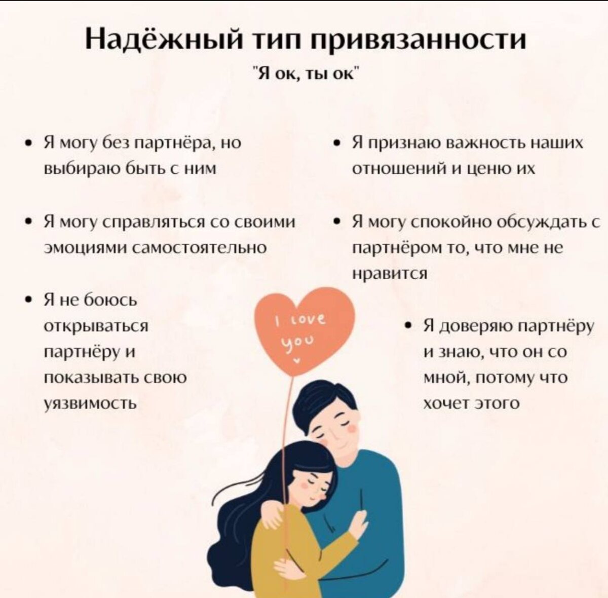 🦋🦋🦋 НАДЕЖНАЯ ПРИВЯЗАННОСТЬ? Доброго дня, дорогие мои💛 Сегодня поговорим о надежном типе привязанности💛 🖐👁🖐Представьте себе уютный дом, где тепло, светло и безопасно. Такими же тёплыми и защищёнными кажутся взаимоотношения, построенные на надёжном типе привязанности. Этот внутренний фундамент закладывается ещё в детстве, когда родители искренне любят ребёнка, поддерживают его, уделяют внимание и помогают ощутить собственную ценность. Когда малыш растёт в атмосфере принятия и заботы, он учится доверять миру и окружающим, становится уверенным в себе человеком. Проходит время, ребёнок вырастает, и вот уже взрослый мужчина или женщина вступает в отношения, наполненные гармонией и искренностью. Они уверены в себе, открыты к эмоциям, готовы поделиться радостью и печалью, выслушать любимого человека и поддержать его в сложной ситуации. Им комфортно как одному, так и вдвоём, они знают цену свободе и ответственности, умея при этом ценить личное пространство и чужое мнение. Для каждо