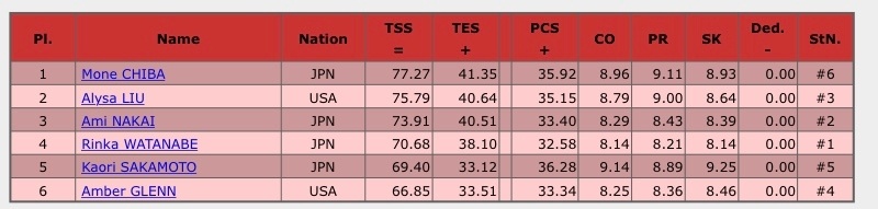 Этот финал собрал две сборные, которые будут делить между собой медали на всех крупных стартах сезона. Приятно видеть, что спортсменки все же усложняются. Три трикселистки против трёх мегакомпонентных фигуристок. Ринка Ватанабе исполняет свою характерную программу танго. Решила взять музыку с вокалом. Практически сценический образ дополняют залакированные волосы (редко встретишь у фигуристок, обычно ограничиваются хвостиками). Очень насыщенного вишневого оттенка платье в сочетании с черным цветом, дополненное массивным украшением, создает образ дорогой и знающей себе цену женщины, которая может спутать чьи - то медальные планы. А вот попробуй - ка отберись у них в сборную, конкуренция очень высокая. Для начала приземлила тройной аксель. Каскад из тройного лутца и тройного тулупа вышел с ошибками на приземлении на обоих прыжках и недокрутом на тулупе. Тройной риттбергер - без усилий. Вокал придаёт драматизма этой постановке и заставляет выкладываться над презентацией. Оценка непл