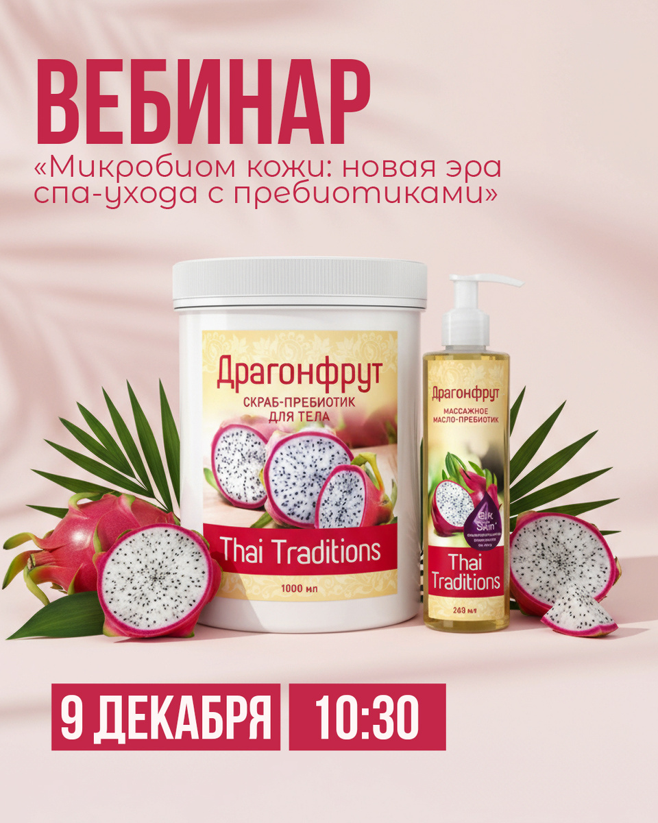🌿 Финальный в 2025 году вебинар по Драгонфруту: «Микробиом кожи: новая эра SPA-ухода с пребиотиками» Мы уже разобрали каждый продукт из линейки: скраб✔️ обертывание ✔️ массажное масло ✔️ массажный крем ✔️ лосьон для тела ✔️ и даже крем для рук✔️ 💚Теперь самое время собрать всё в единую систему и внедрить в работу! На вебинаре: ▪️Мировые тренды 2026 в сфере профессионального ухода за телом. ▪️Микробиом и пребиотики: почему баланс микробиоты теперь в центре внимания клиентов и мастеров. ▪️Серия Драгонфрут от Thai Traditions — пребиотический уход нового поколения: состав, активные ингредиенты и особенности продуктов линейки. ▪️Готовый протокол SPA-программы с серией Драгонфрут: расскажем, как провести процедуру с максимальным эффектом и комфортом. 📅 Дата: 09.12 🕒 Время: 10:30 📍 Зарегистрироваться!