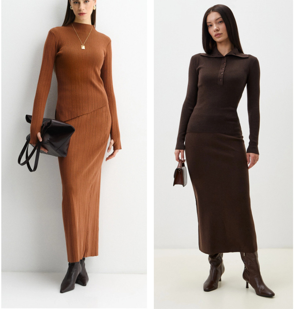 Зима- не повод грустить и мёрзнуть, а отличная причина носить стильные и тёплые наряды. И у меня готова классная капсула, благодаря которой можно выглядеть женственно даже в холодное время года. Вещей и аксессуаров не очень много, но все подобрано так, чтобы можно было создать много разных стильных аутфитов. На все вещи даю ссылки для вашего удобства. Вообще, это должна была быть капсула для девушек весенних цветотипов, но меня немножко занесло - и получилась для осенних, при этом, ярким и теплым вёснам можно примерить - им тоже подойдет почти все. Поехали, разбираем капсулу и смотрим примеры образов. Трикотаж За основу я взяла костюмы, но не деловые, а трикотажные с юбками Костюмы: Светло - коричневый . Юбка длины мидакси и асимметричный джемпер - отличный вариант их фактурного трикотажа. Темно - коричневый. Здесь гладкий трикотаж с джемперм поло и юбкой миди. Еще первые и вторые слои для разнообразия образов: Бежевый комплект классно смотрится вместе, но при этом можно носить и п