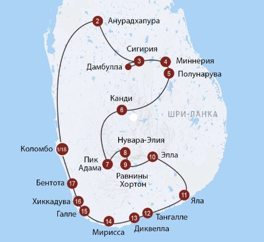 Очень популярный круговой маршрут на 2 недели: Коломбо — Анурадхапура — Дамбулла — Сигирия — Миннерия — Полоннарува — Канди — Пик Адама — Нувара-Элия — Хортон Плейнс — Элла — Яла — Тангалле — Диквелла — Мирисса — Галле — Хиккадува — Бентота — Коломбо. Этот маршрут включает: ✅Древние города и храмы (Анурадхапура, Полоннарува). ✅Сафари в национальных парках (Миннерия, Яла). ✅Высокогорные районы (Нувара-Элия, Хортон Плейнс). ✅Пляжный отдых на юге (Тангалле, Мирисса, Бентота). Я бы советовала проходить этот маршрут не по часовой стрелке, а против - сначала отдохнутьна одном из пляжей: Бентота, Хиккадува, Унаватуна (самый популярный у российских туристов), Мирисса, Диквелла или Тангалле, чтобы набраться сил перед экскурсиями. Либо выбрать что-то наиболее интересное для вас и посетить по отдельности.