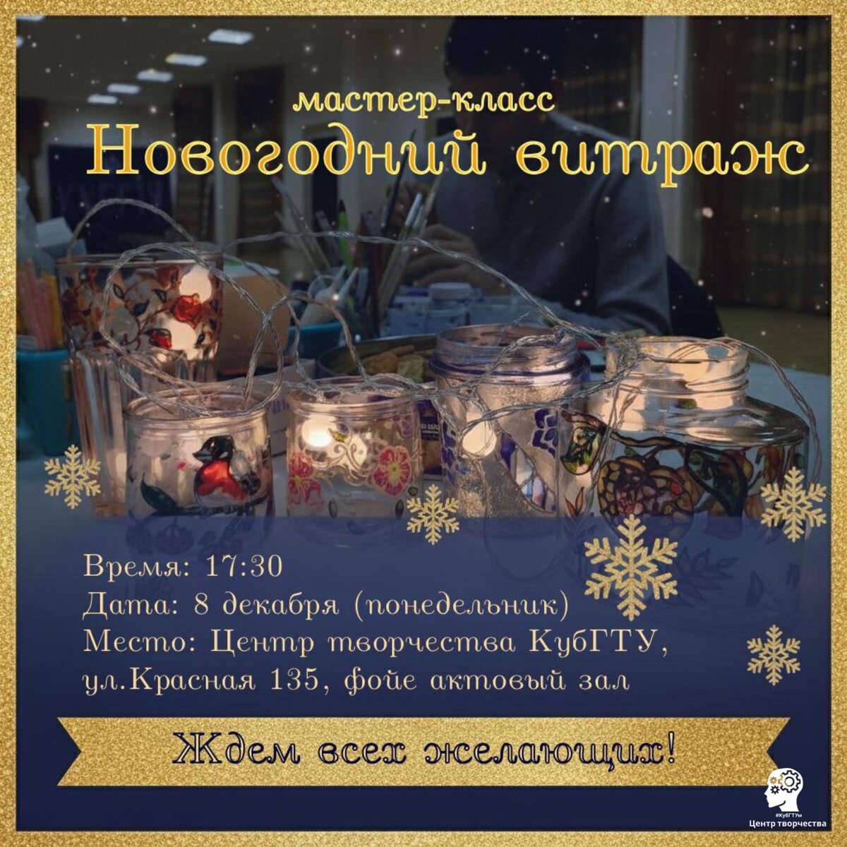 ❄ Зима — не только белый снег, но и тысячи цветных искр в темноте! ✨ Творческий бар приглашает тебя добавить в декабрь волшебства красок. 🎄 🎨Мастер-класс «Новогодний витраж». Создай своими руками витраж, который станет украшением дома или подарком близким! Все материалы предоставляются. 🧊 По желанию возьми стеклянную ёмкость (баночку/бутылочку/стекло) для росписи. Обратите внимание: 🗓Дата: 8 декабря (понедельник) ⏰Время: 17:30 💙 Места: ограничены! Успей забронировать своё место прямо сейчас! 📍Место встречи: ул. Красная 135 (Центр творчества КубГТУ, фойе) Приходи — будем вместе зажигать цветные огни в зимней ночи, и ткать из света свою маленькую новогоднюю сказку. 🌟✨ Подписаться на Центр Творчества: 📱 Телеграм 📱 ВК #ЦентрТворчестваКубГТУ #КубГТУм #КубГТУ #КубанскийПолитех