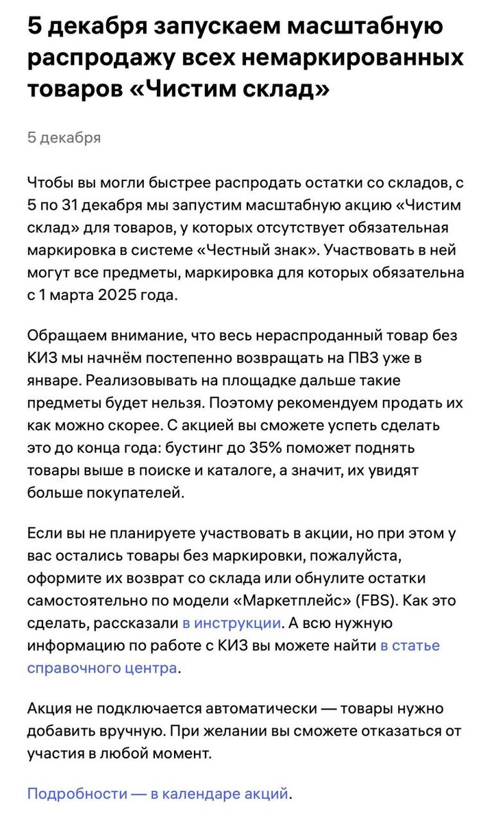 ‼️🤝 Возврат немаркированных товаров Коллеги, все же помнят, что по одежде третья волна маркировки (Маркировка, которая началась 1/03/2025) запрет реализации немаркированных товаров наступает 31 декабря 2025г? На этот раз WB в отличие от других волн маркировки оповестил, что будет возвращать ВЕСЬ немаркированный товар, который числится на их складах, также контролировать FBS отправки, которые будут без маркировки. Напомню, что в предыдущих волнах давался выбор и возврат носил рекомендательный характер многие судя по нашему опросу НЕ забирали товар, и все распродавали без проблем, а сейчас уже ОБЯЗАТЕЛЬНО забирать. Надеюсь ни у кого не остался немаркированный товар на складах WB? @it_mps MarkZnak.ru