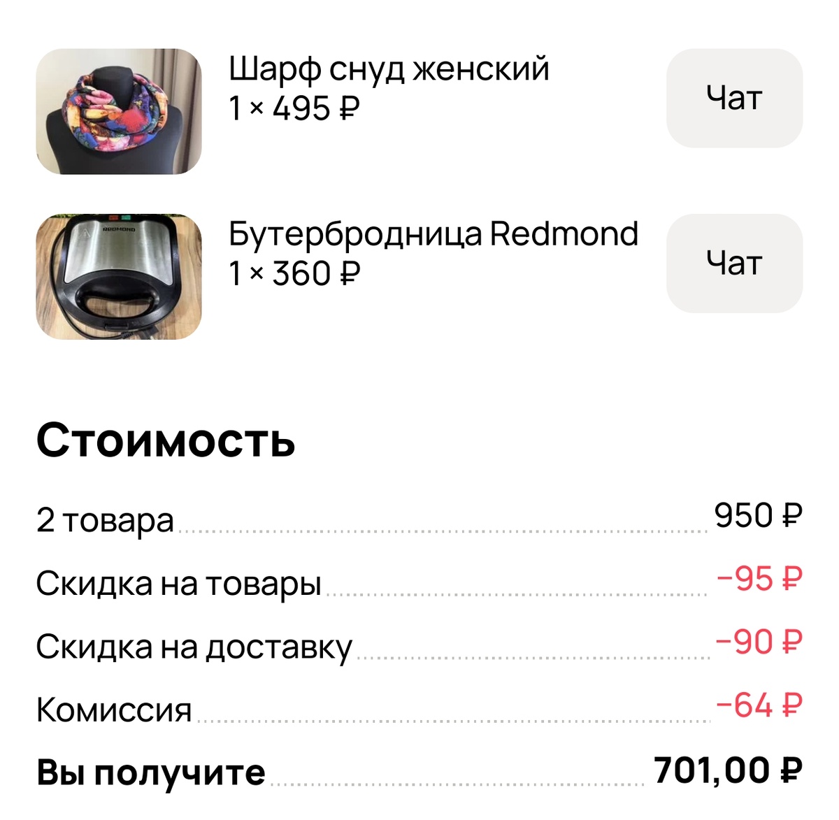 Всем привет! 👋 На связи Булочка, и опять я со своими продажами на Авито. 😀 Копятся как снежный ком, знаете ли. Надо же вас в курсе держать — «Че почем, хоккей с мячом». Тут недавно в комментариях прочитала, что людям неприятно, когда человек пишет «грибочек, ёлочка», ну вы поняли. Я думаю: а я вообще «Булочка»… но если бы была «Булка про жизнь» — тоже как-то странно. 🤔 Теперь в общем пишу и исправляю «грибочек» на «гриб», стала обращать внимание. 😀 Приступим к продажам: 1. Заказ двойной через корзину. Интересный набор отправила СДЭКом в Крым. Состоит он из старенькой бутербродницы и красивого шарфа-снуда. Я не поняла как, но две вещи вышли на 700 рублей. Наподключала, называется, скидок и распродаж. 😀 Плюс скидка за заказ корзиной. Ну да ладно. Насчёт бутербродницы я вообще сомневалась — выбросить или выставить. Мне кажется, она своё отслужила. Но тем не менее работает, греет. В описании так и указала, мол, продам старушку-бутербродницу. Вообще, средний чек заказов что-то упал