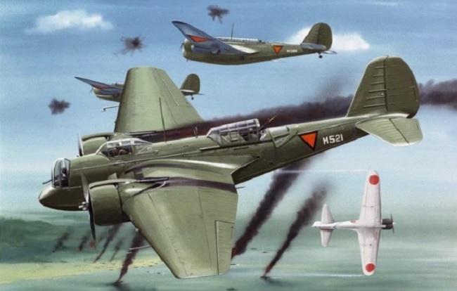 По хорошей традиции, с картинками голландских «Мартинов» опять беда: не любят их профильные «рисовальщики». От безысходности везде и всюду используют произведение историка и художника из Нидерландов Тэйса Постма (Thijs Postma), ну а мы что, рыжие? Итак. 13 января 1942 года. На картине три «Мартина» у острова Таракан (Западный Борнео) превозмогают «Зеро» на фоне горящих вражеских пароходов. На практике всё было немного прозаичнее. Вылет такой был: три тройки бомбардировщиков из разных эскадрилий действительно полетели в район Таракана, правда одна заблудилась и с японским «Комитетом по встрече» к счастью разминулась . Об ущербе вражеским плавсредствам ничего неизвестно, зато известно о голландских потерях: пять «Мартинов», сбитых «Зеро» корпуса Таинан, при, о чудо, именно пяти заявках японцев. Уже горящая машина на переднем плане (б/н M521, в реалиях модификации WH-2, но на картинке изображён WH-1) была позднее повреждена японцами на земле и в начале марта 42-го списана.