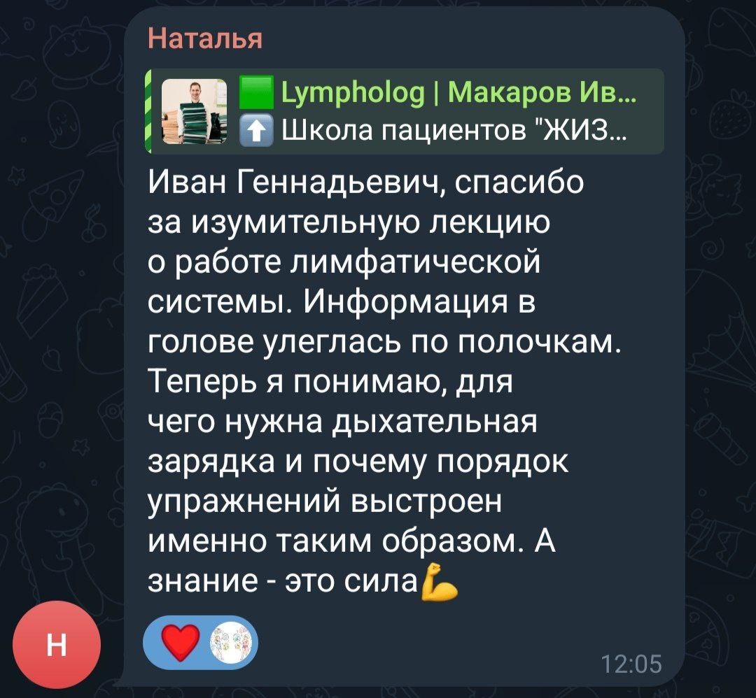 Школа пациентов "ЖИЗНЬ С ЛИМФЕДЕМОЙ" Здравствуйте, дорогие друзья! 👋 В четверг прошло первое занятие школы, где мы разобрали то, как работает лимфатическая система, почему ломается и какие методы исследования лимфатических сосудов существует. Нам удалось сделать запись этого занятия и всем, кто регистрировался или зарегистрируется на мероприятие до понедельника, мы ее отправим, чтобы вы смогли подготовиться к следующей встрече. На ней мы разберем методы лечения лимфедемы - хирургические, консервативные и комбинированные. 📅 Дата - 18 декабря 16:00 🕔 Формат - онлайн 💬 Участие бесплатное 👉 Регистрация по ссылке: https://limpha.ru/schooloflymphedema Буду рад видеть вас на занятиях. Прохождение школы пациентов - это важный шаг, который поможет вам уверенно бороться с лимфедемой. Желаю вам удачи и терпения на этом пути!