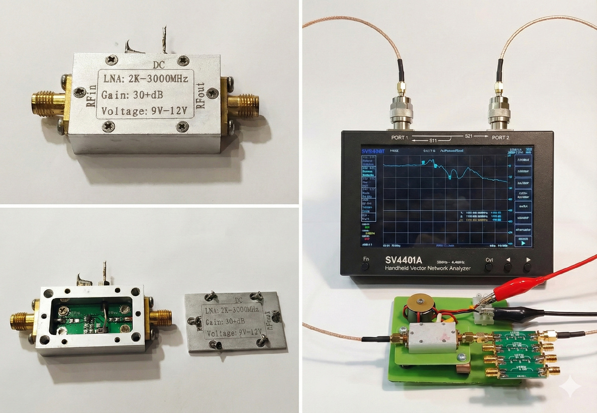 Используемый нами для радиоастрономических наблюдений МШУ TZT. Проверяем его характеристики, на сколько они соответствуют заявленным производителем. Для начала нужно выяснить на какой микросхеме собран МШУ и изучить ее Datasheet. Снимаем верхнюю крышку. Микросхема в корпусе SOT363. По маркировке определяем наименование - BGA2869. И так... BGA2869 имеет согласование Вх-Вых 50 Ом, NF на частоте 1420 МГц - 3 дБ, коэффициент передачи на частоте 1420 МГц порядка 30 дБ. Определяем эквивалентную шумовую температуру МШУ Tэ при NF = 3 дБ: Где: T0 = 290K. Температура окружающей среды. Подставив исходные значения в данное выражение получим Tэ = 290К. Иначе говоря этот МШУ добавляет в полезному сигналу шум, эквивалентный нагретому до комнатной температуре резистору. В таком случае можно ожидать, что общий шум системы будет составлять примерно 350К, что в значительной степени скажется на чувствительности приемника. К примеру Tэ для SPF5189Z составляет всего 35К. Вместе с тем, также нужно учес