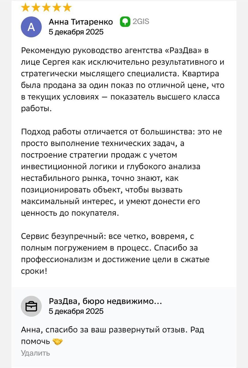 Прошла сделка по продаже однокомнатной квартиры. Квартира была продана за один показ. Поставленные задачи со стороны продавца и покупателя выполнены. Каждая сделка по недвижимости индивидуальна, не обошлось без нюансов. Каждый раз думайте о цели, а не сосредотачивайтесь на проблеме, и будет вам … два благодарных отзыва и не только. Отдельно хочу поблагодарить продавца и покупателя🤝 С вами приятно работать и пусть на вашем пути попадаются такие же люди 🤝🌞 Отзывы о моей работе и работе моей команды можете прочитать на Яндекс и 2гис. Наши отзывы : https://yandex.ru/profile/154935560937?lang=ru https://2gis.ru/reviews/70000001082862976/addReview?utm_source=lk