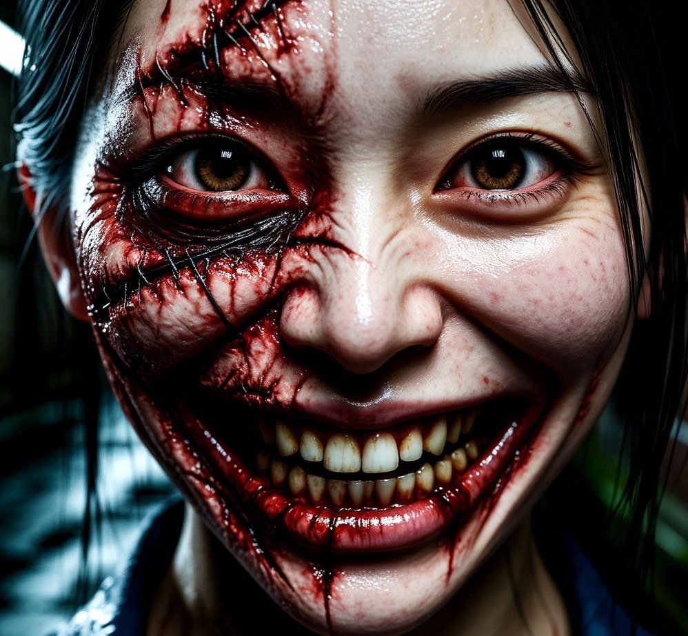 То, что открывается вашему взгляду, не укладывается в сознании. От углов её рта до мочек ушей тянется жуткий, зашитый грубыми медицинскими нитками шрам. Её рот — это гигантская, горизонтальная рана, улыбка клоуна из кошмаров. Она повторяет вопрос, и теперь её голос звучит иначе — в нём слышится металлический скрежет и бесконечная боль: