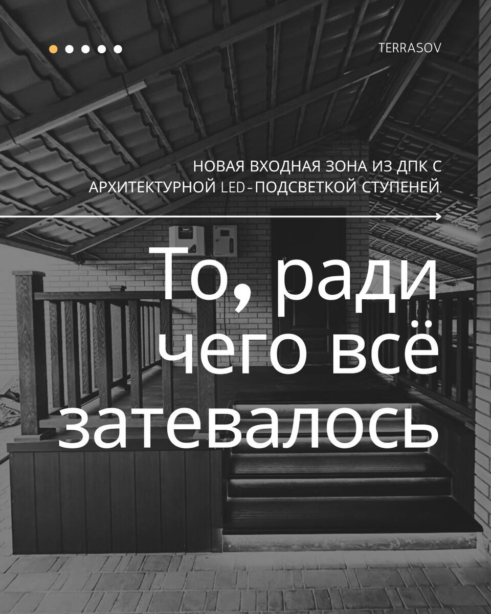 Когда «до» и «после» как два разных адреса. Это крыльцо когда-то было типичным примером того, как временное решение превращается в постоянное: разбитый бетон, неровные ступени, никакой геометрии и ноль эстетики. Хозяева хотели не просто «поменять ступеньки», а полностью обновить входную группу так, чтобы она выглядела гармонично с домом и была долговечной на годы вперёд. Мы сделали комплексную реконструкцию: 🔸 Полный демонтаж старых ступеней 🔸 Создание новой основы и правильной геометрии 🔸 Монтаж облицовки и ограждений из ДПК 🔸 Установка современной линейной LED-подсветки ступеней 🔸 Защита торцов и аккуратная обвязка всей конструкции Теперь это место не просто вход, а стильная архитектурная часть дома. Вечером подсветка даёт мягкое свечение, делает ступени безопаснее и добавляет атмосферы уюта. Если вы хотите привести своё крыльцо, веранду или террасу к такому же уровню напишите «хочу расчёт», сделаем проект под ваш дом.