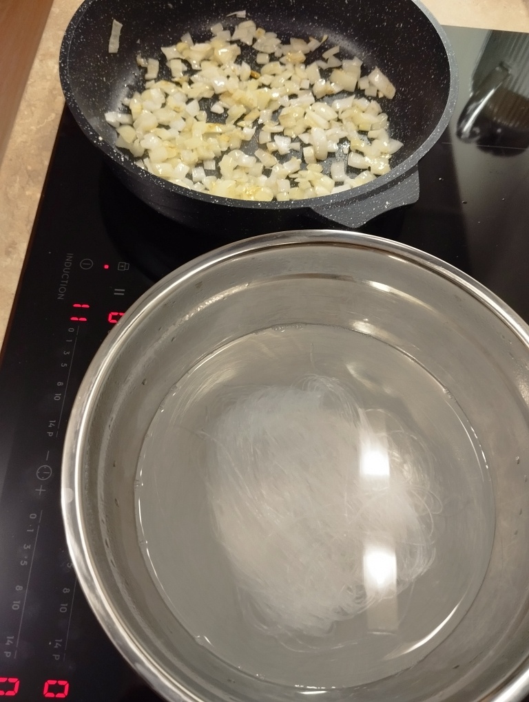 Я покупала упаковку рисовой бумаги для закуски с крабовыми палочками, но там осталось еще много листов. Я решила сделать рулетики, тем более фунчеза для начинки у меня тоже была. Заливаем фунчезу горячей водой и ставим обжариваться лук, потом добавляем к нему натертую морковь. Для мясной составляющей начинки я использовала два бургера из последнего заказа из Лавки, но можно положить 200гр фарша. Начинка: 200гр фарша жареный лук и морковь 50гр фунчезы 1 яйцо соль, специи Я добавила в начинку Вустеширский соус и черный перец. Можно добавить грибы. Рисовую бумагу опускаем в воду на минуту и заворачиваем в нее начинку. Все, как при фаршировании блинчиков. Я думала, будет трудно все это красиво закрутить и бумага будет рваться, ведь она такая тонкая. Но она остается довольно прочной и процесс заворачивания не сложный. Она может липнуть сама к себе, но это все благополучно разлепляется. Даже если где-то блинчик порвался, в общем изделии это не заметно, из-за того, что там несколько слоев