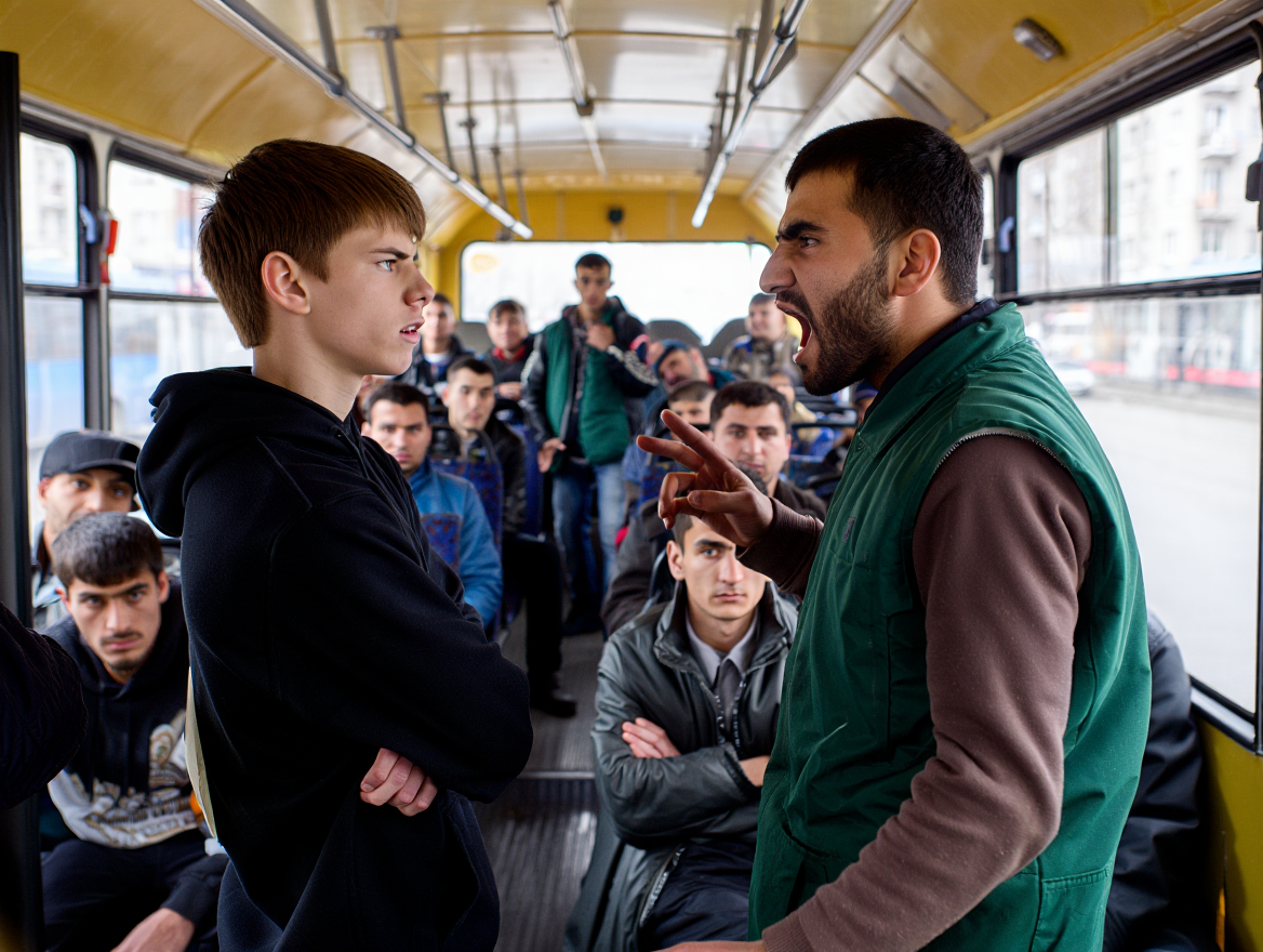 В Москве произошёл инцидент, который наглядно демонстрирует, что молодое поколение не готово мириться с агрессией и навязыванием чужих взглядов на внешний вид. Обычная поездка в городском автобусе обернулась конфликтом, когда к группе подростков решил пристать пьяный мужчина, возмущённый их манерой одеваться. Ситуация, начавшаяся со словесной перепалки, получила неожиданное продолжение уже на улице. Начало конфликта в салоне Всё началось в салоне обычного московского автобуса, где ехала группа молодых людей. К ним обратился нетрезвый иностранный специалист, которому, судя по всему, крайне не понравился внешний вид подростков. Для таких людей часто становится поводом для конфликта любая деталь, не соответствующая их личному представлению о должном, будь то цвет волос, одежда или манера поведения. Вместо того, чтобы спокойно продолжать поездку, мужчина решил "докопаться" до молодёжи, высказав свои претензии в грубой и, вероятно, оскорбительной форме. Такое поведение в общественном тран