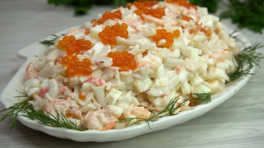 Итог: Этот салат — настоящая находка для праздника. Он выглядит нарядно, готовится без сложных приемов, а вкус всегда получается сбалансированным и свежим. Проверено: даже те, кто обычно равнодушен к морепродуктам, просят добавку.
