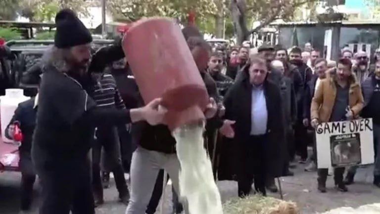 В Греции протестующие фермеры залили центральную площадь молоком Они вылили на дорогу минимум восемь больших бидонов. В каждом из них было около 40 литров молока. Это ответ на арест трех фермеров во время блокады колонной тракторов автомагистрали в минувшее воскресенье. Причинами протеста стали задержка выплат субсидий, рост затрат на производство и низкие закупочные цены на сельхозпродукцию.