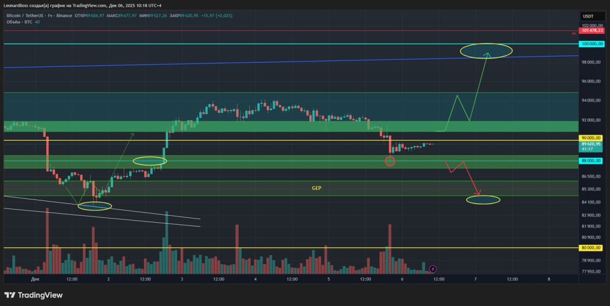 #мнениепорынку 🕯🕯🕯 ⚠️Как сказал ранее, BTC закрыл вчерашний день ниже уровня 90К, давайте смотреть, насколько всё плохо и критично?? Как видим, снижение цены произошло четко от зоны уровня 93К и того самого глобального блока сопротивления, о котором было сказано неоднократно, соответственно чего-либо неожиданного не произошло, хотя и нарушены локальные ожидания. Примечательно то, что цена идеально ударила в уровень 88К, от которого она работала в обе стороны на протяжении последних двух недель, а значит наше внимание в очередной раз переключается не него!! ⚠️С учетом данного уровня 88К, локальная вероятность ближайшего движения цены довольно проста и понятна: в случае пробоя уровня 88К будем наблюдать продолжение снижения в сторону прежнего GEPa (локального блока поддержки), ну а выход цены на уровень 90К продолжит сценарий формирования аккумуляции (боковика) с походом с сторону уровня 100К. Важно помнить, что любое движение цены BTC в одну из сторон оставит после себя свежий GEP,