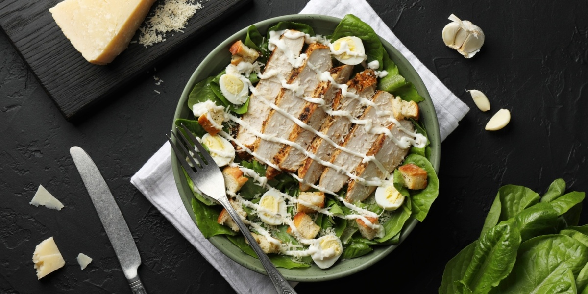 Количество порций: 2 🥗 Салат «Цезарь» с перепелиными яйцами Приготовление Разогрейте сковороду и обжарьте куриную грудку между листами для жарки — без масла. Остудите мясо и нарежьте красивыми слайсами. Отварите перепелиные яйца (4–5 минут), охладите, очистите и разрежьте пополам. Сделайте соус: смешайте майонез, лимонный сок, горчицу и чеснок. Романо промойте, обсушите. Сыр натрите на мелкой тёрке. Хлеб нарежьте кубиками,