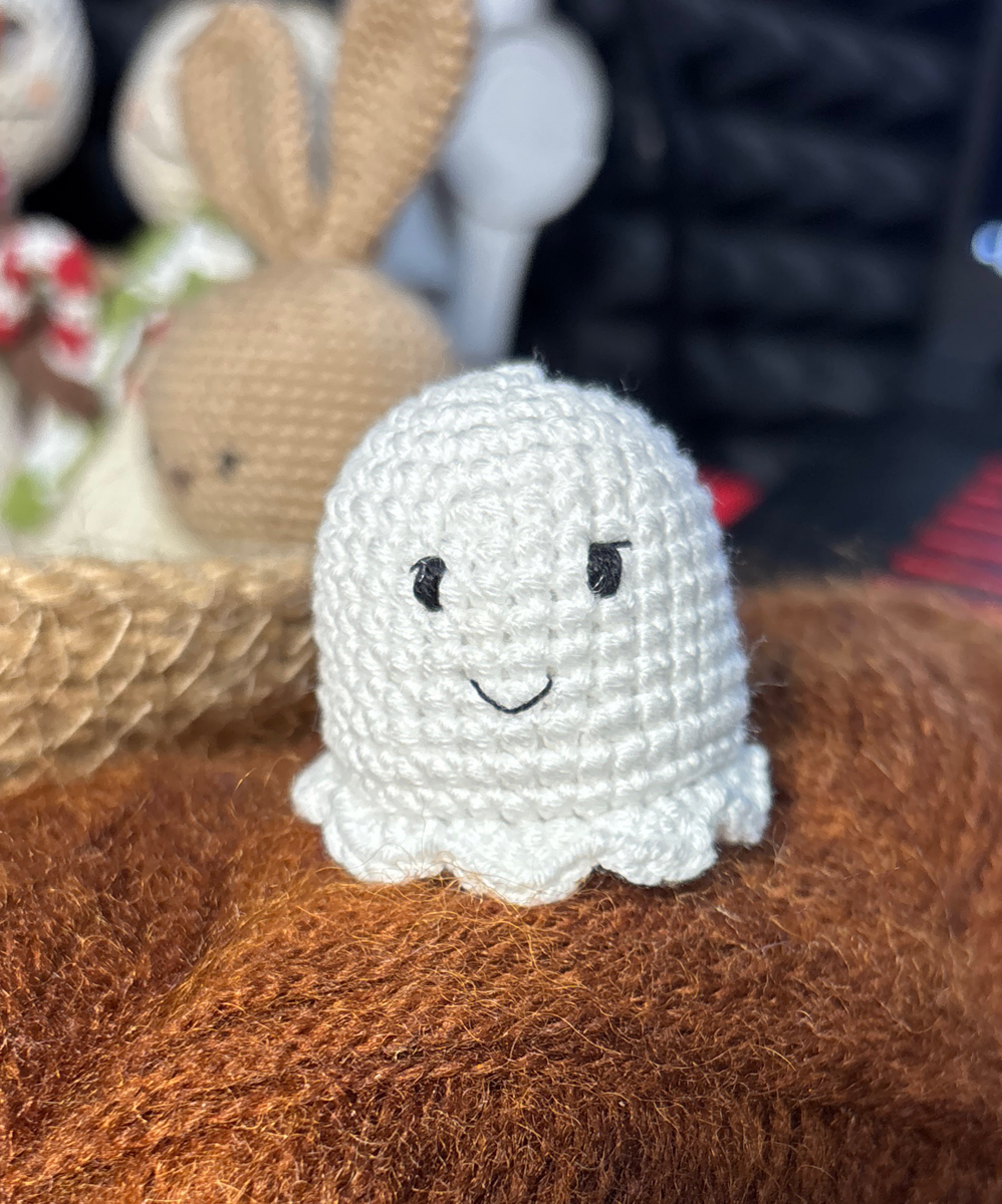 КА-кольцо амигуруми Сс-соединительный столбик Сбн-столбик без накида Пр-прибавка из столбиков без накида (2сбн в 1 петлю) Уб-убавка (2 петли объединены 1сбн) Псн-полустолбик с накидом Ссн-столбик с накидом ЗЗП-за заднюю стенку петли Описание вязания: 1) 6сбн в КА (6) 2) 6 пр (12) 3) (1сбн+пр)х6 (18) 4) (2сбн+пр)х6 (24) 5-7) 24сбн /3ряда (24) 8) (3сбн+пр)х6 (30) 9-11) 30сбн /3ряда (30) 12) (4сбн+пр)х6 (36) 13) 36сбн (36) 14) ЗЗП (4сбн+уб)х6 (30) 15) (3сбн+уб)х6 (24) 16) (2сбн+уб)х6 (18) На этом этапе можно набить Привиденьку. 17) (1сбн+уб)х6 (12) 18) 6уб (6) нить закрепить и спрятать Возвращаемся к 14 ряду,присоединяем нить за любую переднюю стенку петли и по кругу вяжем: (сбн+в одну полупетлю (псн ,ссн,псн)+сбн+сс)х9 это мы связали подол. Ниточку закрепили и спрятали. Берем черную ниточку вышиваем глазки в 9 ряду можно по диагонали 1сбн или по вертикали 1сбн расстояние между глаз может быть любое,ротик вышиваем в 1нить в 12 ряду между глазок. Ниточку закрепляем,обрезаем,можно придела